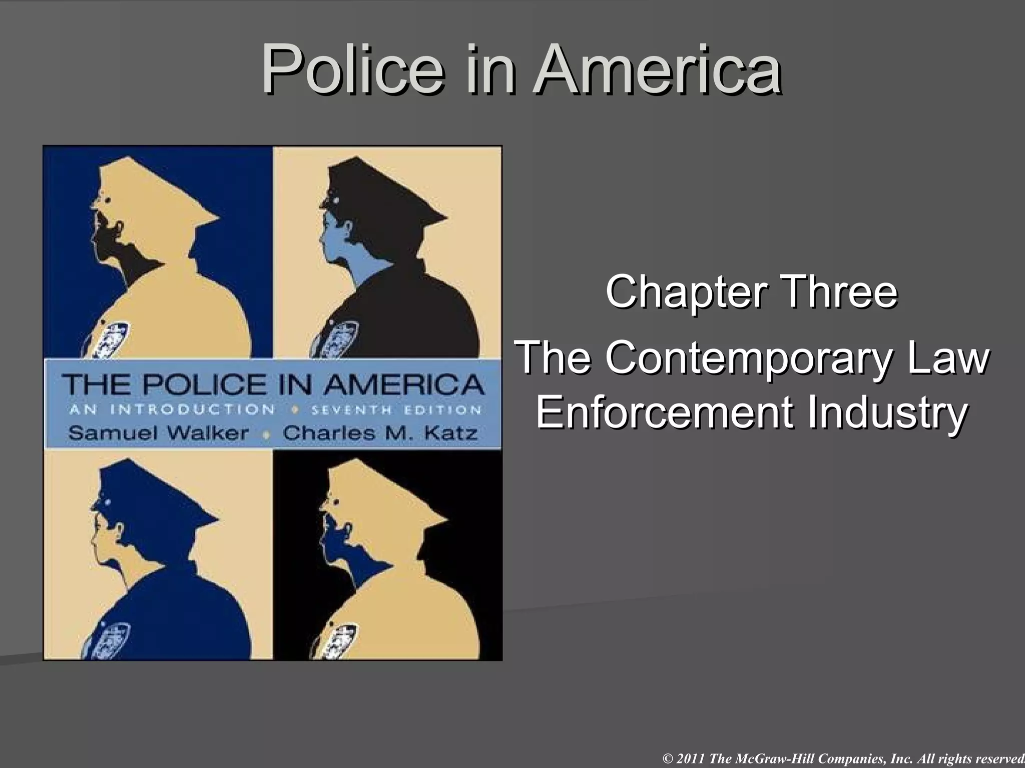 The document discusses the contemporary law enforcement industry in America. It notes that law enforcement is highly fragmented and decentralized, with over 17,000 agencies across four levels of government. It also describes the various types of agencies that make up the industry, including municipal police, county sheriffs, state police, federal agencies, and private security firms. The industry employs over 3 million people between public and private organizations.