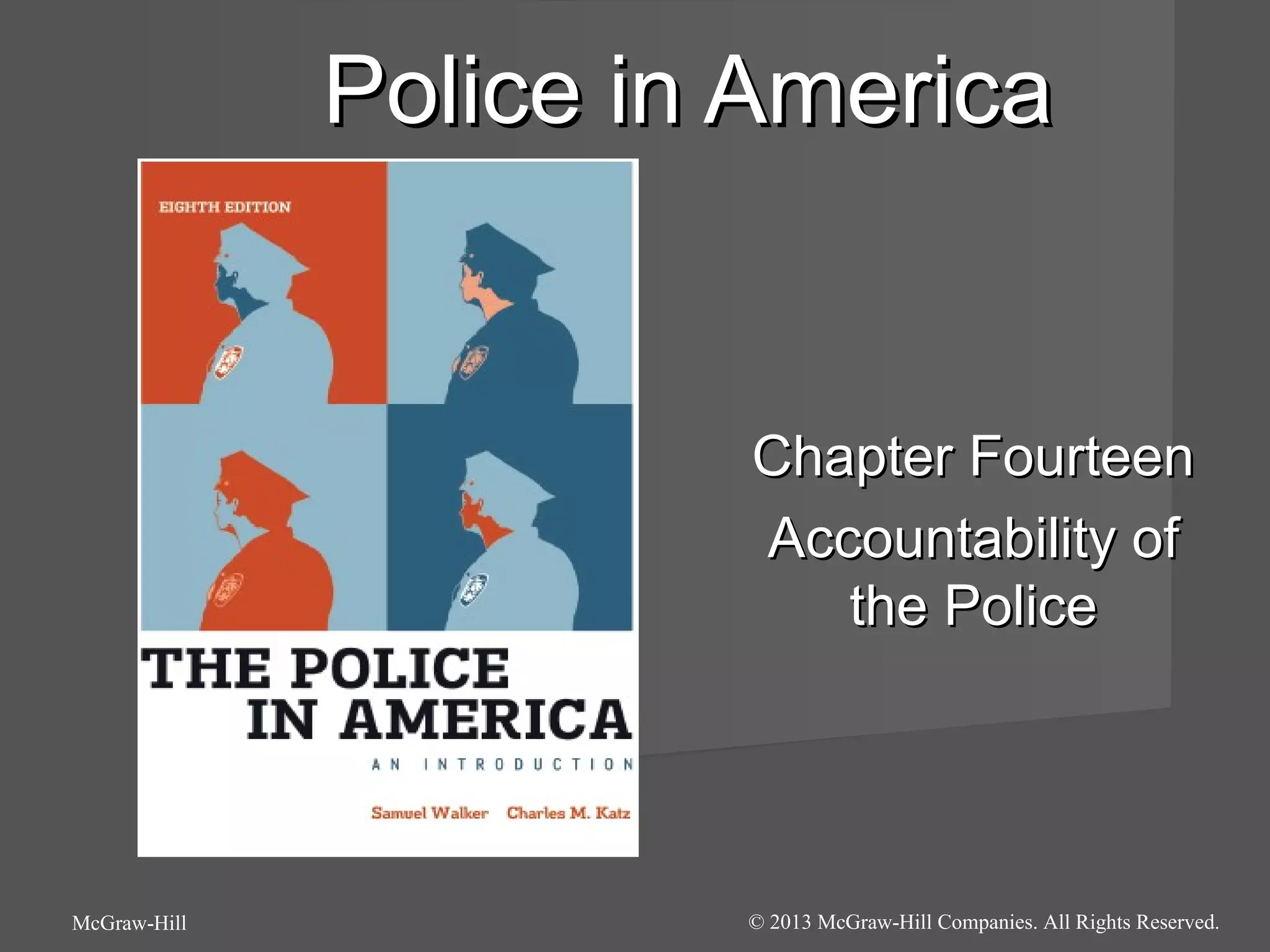 The document discusses various mechanisms for holding police accountable in America, including both internal police mechanisms and external oversight. It describes accountability as police answering for their conduct to the public, officials, and courts. Internally, it discusses supervision, policies, complaint investigations, early intervention systems to identify problematic officers, and accreditation. Externally, it outlines political, judicial, civil lawsuit, federal pattern/practice suits, consent decrees, injunctions, criminal prosecution, and citizen oversight options.
