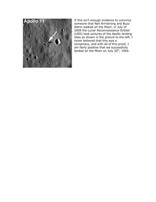 The document discusses claims that the 1969 moon landing was faked and provides evidence to refute those claims. It notes that NASA would have no motive to fake such a momentous event and that moon rocks brought back match substances that could only be found extraterrestrially. Experiments by MythBusters replicated conditions to prove lighting could account for brightness in shadows and footprints could form in lunar regolith. Photos from the Lunar Reconnaissance Orbiter in 2009 also showed artifacts from the landings, providing strong evidence that the moon landings were, in fact, real.