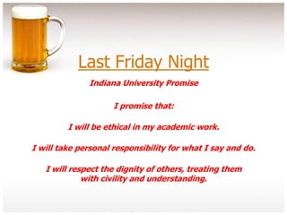 This document contains information from various organizations at Indiana University regarding student life, responsibilities, and health and safety. It includes a promise to be ethical, take responsibility for one's actions, and respect others. It also discusses the values of friendship, character development, liberal culture and justice promoted by Delta Upsilon fraternity. The rest examines potential myths around drinking, drug use, and sexual assault through a "fact or myth" series.