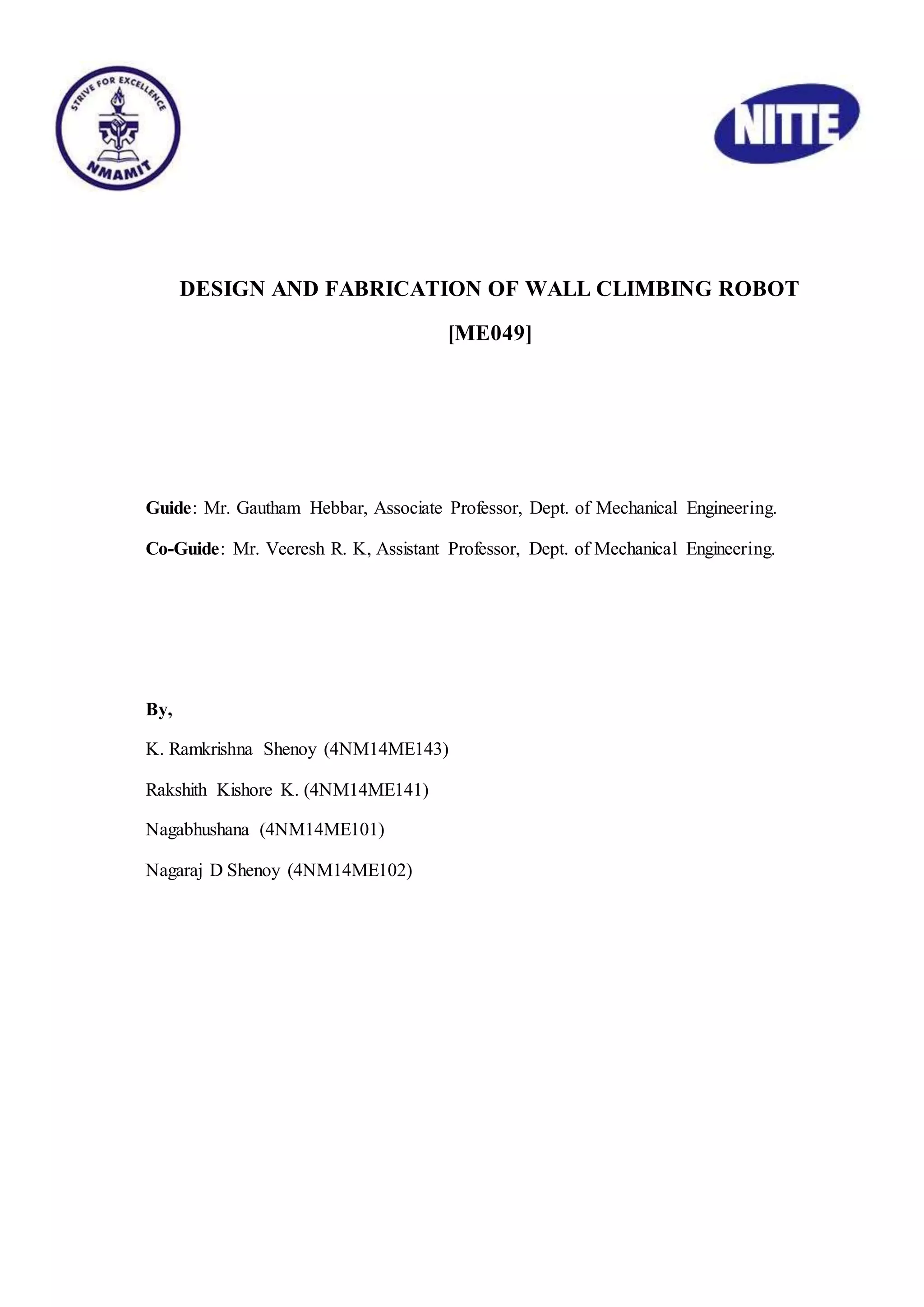 This document describes the design and fabrication of a wall climbing robot project undertaken by four students. The robot will use a tracked wheel mechanism and suction cups to climb walls for applications such as cleaning, inspection, and maintenance. The objectives are to design, fabricate, and test the performance of the robot. Literature on wall climbing robots was reviewed regarding locomotion mechanisms, adhesion methods, and design considerations. A project timeline is provided outlining the design, ordering of parts, fabrication, assembly, and report writing over several months.
