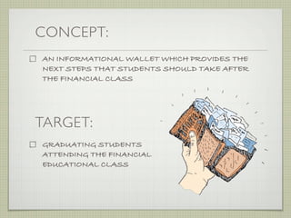 The document outlines a workshop initiative aimed at graduating students to create their own informational wallets to address the problem of inadequate money storage options. It highlights the creative teaching approach, encouraging self-expression and practical financial skills while providing a physical reminder of financial education. The workshop aims to equip students with valuable skills and a better means to save their money as they transition to rural environments.