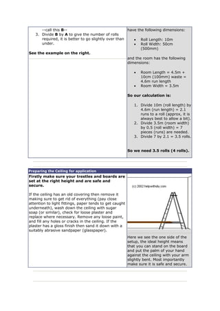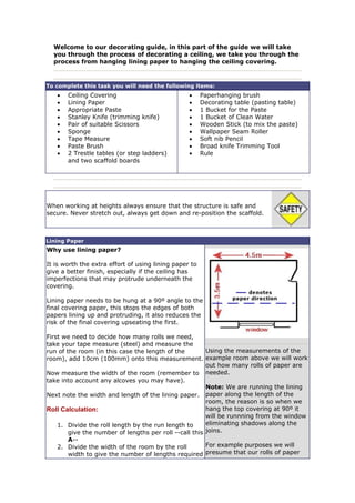 This document provides instructions for decorating a ceiling by hanging lining paper and a ceiling covering. It lists the necessary tools and materials and guides the reader through each step of the process, from preparing the ceiling surface to measuring and cutting the lining paper to hanging it in sections and smoothing the joints. Key steps include marking guide lines on the ceiling, mixing paste, hanging the first piece of lining paper perfectly straight, butting subsequent pieces up to the previous one, and using a seam roller or paint roller to smooth the edges once dry. Following these instructions ensures the ceiling is properly prepared and lined to allow for neatly hanging the final covering.