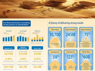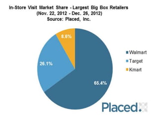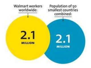 Walmart is the largest retailer in the world, operating over 11,000 stores worldwide. It was founded in 1962 by Sam Walton and pioneered the use of large stores located in suburbs selling a variety of goods at low prices. Walmart revolutionized the retail industry and became highly successful by keeping costs low and passing the savings on to customers in the form of "everyday low prices." Today, Walmart remains family-owned and continues to focus on low prices while also expanding into e-commerce and international markets. It employs over 2 million people worldwide, making it one of the largest private employers.