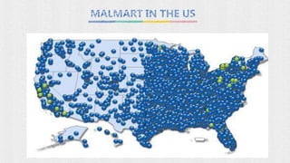 Walmart was founded in 1962 in Arkansas by Sam Walton. It is now the largest company in the world by revenue, operating over 11,000 stores across 28 countries. Walmart employs over 2 million people worldwide and had revenue of $485.9 billion in 2017. Its business strategy involves achieving cost leadership through large scale operations and supply chain efficiency while also differentiating itself through its own private label brands. However, Walmart faces challenges from competitors like Amazon and must continue adapting to changes in customer behavior and the retail environment through digital transformation and other initiatives.