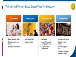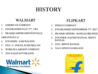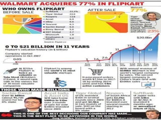 Walmart acquired a 77% stake in Flipkart for $16 billion, valuing the Indian e-commerce company at $20.77 billion. This represents the largest acquisition of an e-commerce company. Sachin Bansal sold his 5.5-6% stake but Binny Bansal will remain as CEO of Flipkart. Walmart wanted to increase its stake to 85% to enter and capture the rapidly growing Indian market and compete with rival Amazon. Flipkart holds the majority of Indian consumers and has a strong supply chain network serving over 800 cities daily.