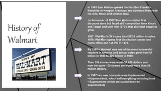 Walmart began in 1945 as a Ben Franklin franchise owned by Sam Walton and family. In the 1960s, Walton started his first discount store but faced competition. By the 1980s, Walmart was one of the most successful retailers in America with annual sales growing from $1 billion in 1980 to $26 billion in 1989. In 1987, Walmart implemented two new concepts: hypermarkets selling everything including food, and supercenters which were scaled down hypermarkets. Walmart's key competitive advantages included low prices, large number of stores, wide product variety, strong vendor relationships, and efficient communications and logistics networks.