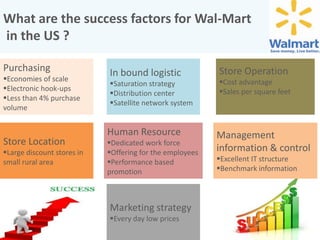 This document discusses Walmart's success factors in the US and examines whether these factors led to success in other countries. It analyzes Walmart's entry and failures in Germany, South Korea, Brazil, China, Japan, and briefly mentions failures in Hong Kong, Indonesia, and Russia. Key reasons for failure included an inability to adapt strategies to local market differences, high operating costs, lack of relationships with suppliers, and not fully understanding local consumer preferences. The document suggests Walmart's IT and supply chain strategies were more successful in China.