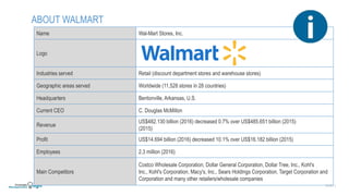 Wal-Mart Stores, Inc. is the world's largest retailer by revenue, with $482.1 billion in sales for 2016, primarily from its U.S. operations. The company operates in three main segments: Walmart U.S., Walmart International, and Sam's Club, and heavily relies on the U.S. market for its revenue. Challenges include increasing saturation in foreign markets and overdependence on U.S. sales.
