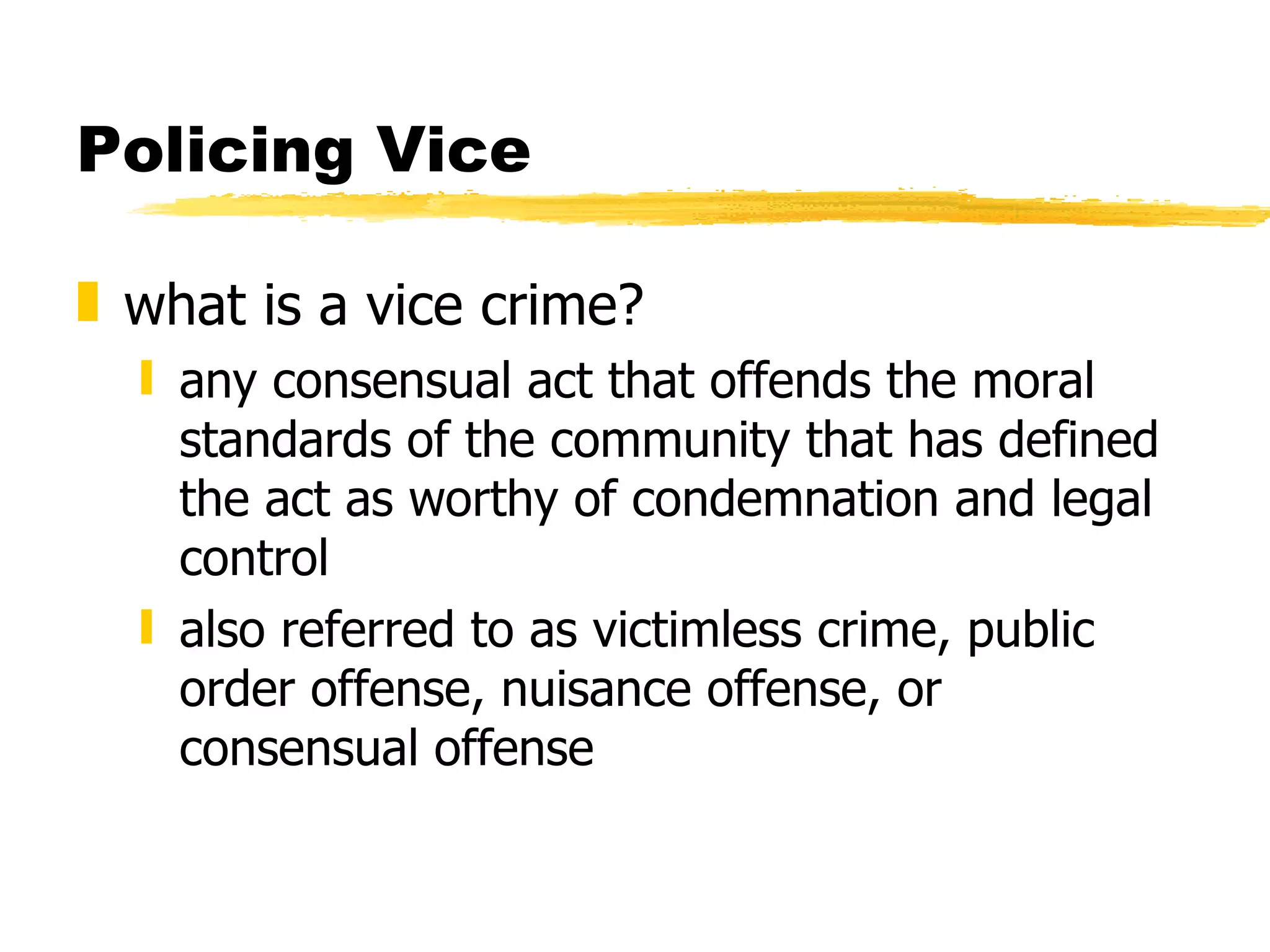 This chapter discusses different types of vice crimes including homosexuality, prostitution, pornography, abortion, alcohol, and illicit drugs. It explores debates around decriminalizing or legalizing certain vice crimes like prostitution as well as historical shifts in attitudes towards crimes like homosexuality. The chapter also examines Supreme Court cases that have impacted laws around issues like abortion and obscenity.