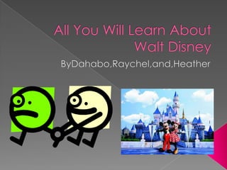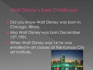 Walt Disney was born in Chicago in 1901 and grew up taking art classes. He is famous for founding The Walt Disney Company and creating beloved animated characters like Mickey Mouse. Some of his most famous and influential animated films include Snow White and the Seven Dwarfs, Cinderella, and Mary Poppins. Walt Disney died in 1966 of lung cancer at the age of 65, but his creative legacy lives on through his animated works.