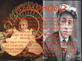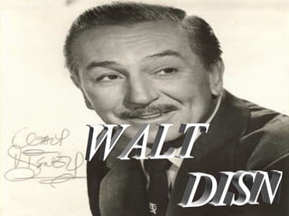 Walt Disney was born in Chicago in 1901 and showed an early interest in art. He pursued art in high school and enjoyed nature. During WWI, Disney served as an ambulance driver in France. After the war, he founded Walt Disney Studios and created successful animated shorts like Alice Comedies. Disney married Lillian Bounds in 1925 and they had two daughters. His studio produced the first animated feature film Snow White in 1937 and other classics like Pinocchio and Bambi. Disney opened Disneyland in 1955 and became a pioneer in television production. He also produced educational documentaries and oversaw the development of Walt Disney World in Florida.