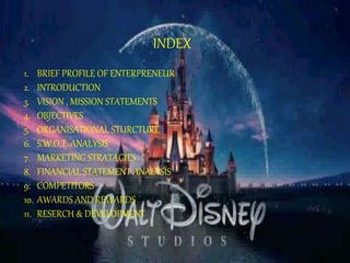 Walt Disney was an American entrepreneur and animator who founded The Walt Disney Company. He pioneered the American animation industry with the creation of Mickey Mouse in 1928. In the 1950s, Disney expanded into theme parks and opened Disneyland. The Walt Disney Company's mission is to be a leading producer and provider of entertainment and information worldwide. Disney's vision is to bring happiness to millions. Some of Disney's successes include winning many Academy Awards and maintaining strong brand reputation and loyal customers through strategic acquisitions and expansion into new markets globally.