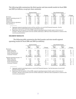 - Disney reported higher revenues and earnings per share for the third quarter and first nine months of fiscal year 2006 compared to the same periods in 2005. Revenues increased 12% for the quarter and 5% year-to-date, while EPS grew 36% and 24% respectively.