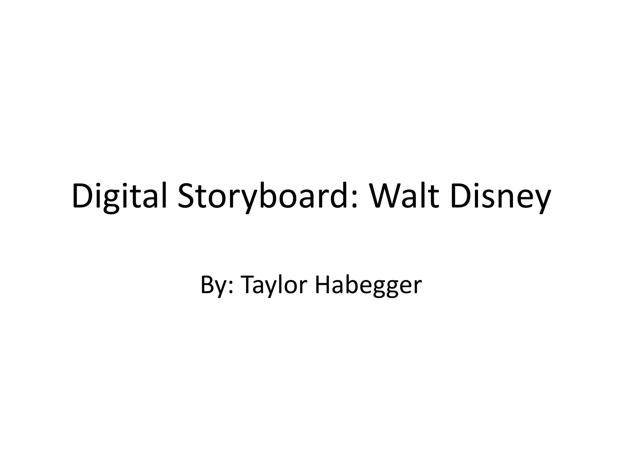 Walt Disney was born in 1901 in Chicago and showed an early interest in drawing and cartoons. He dropped out of high school to join the army but later worked for ad agencies creating commercials using animation. Disney founded his own studio and created iconic characters like Mickey Mouse. He pioneered full-length animated films with Snow White and built Disneyland theme park, laying the foundation for his entertainment empire. Disney revolutionized animation and family entertainment before passing away in 1966.