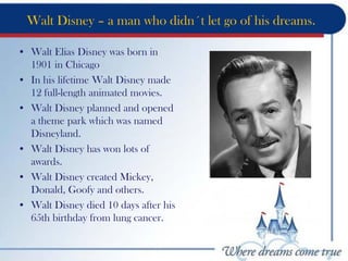 Walt Disney World Resort is located near Orlando, Florida and covers over 11,000 hectares. It includes 4 theme parks (Magic Kingdom, Epcot, Disney's Hollywood Studios, and Disney's Animal Kingdom), 2 water parks (Typhoon Lagoon and Blizzard Beach), 27 themed resort hotels, 1 camping resort, and 4 golf courses. Walt Disney first began searching for a location for another theme park in 1959, though he passed away before its construction. Walt Disney World officially opened on October 1, 1971 and continues to be a popular tourist destination for families.