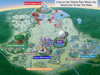 This document appears to be a menu or map of rides at a theme park, with each ride listed individually along with its name and icon. There are over 20 rides featured across different lands or sections of the park. Visitors can click on each ride to see more details or select their preferred rides to experience.
