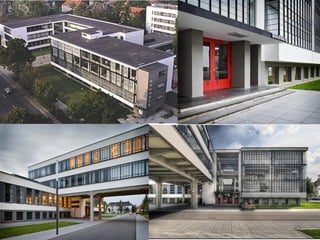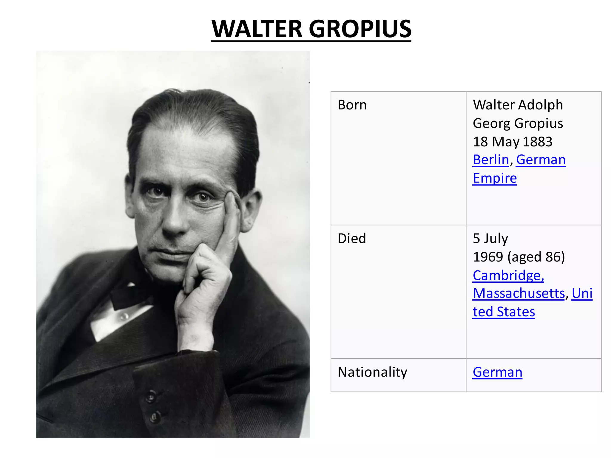 Walter Gropius (1883-1969) was a German architect and founder of the Bauhaus school, renowned for modern architecture alongside figures like Le Corbusier and Frank Lloyd Wright. He served in World War I and later transformed the Grand-Ducal Saxon School of Arts and Crafts into the influential Bauhaus in 1919, which integrated art, craft, and industrial design. Gropius's innovative designs emphasized functionality, aesthetics, and the use of modern materials, with notable works including the Gropius House in Massachusetts and the Bauhaus building in Dessau.