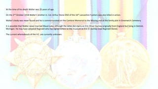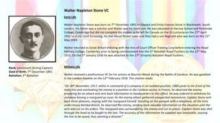 Walter Napleton Stone, born on December 7, 1891, served as a lieutenant and later as acting captain in the 3rd Battalion Royal Fusiliers during World War I. He posthumously received the Victoria Cross for his heroic actions at Bourlon Wood on November 30, 1917, where he provided critical intelligence under heavy fire before being killed in action. His body was never found, and he is commemorated on the Cambrai Memorial and at his family plot in Greenwich Cemetery.