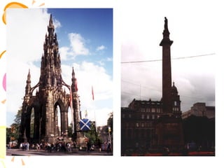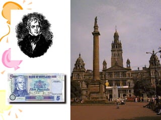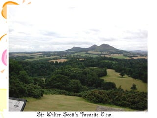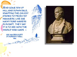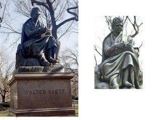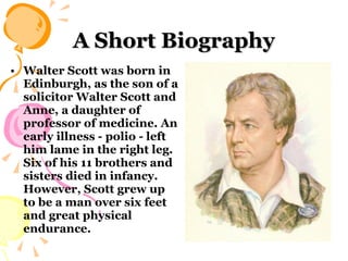 Walter Scott was a famous Scottish historical novelist born in 1771. He was interested in old Scottish ballads from a young age. His early works focused on collecting these ballads. His first major success was The Lay of the Last Minstrel in 1805. He then published other long narrative poems including Marmion and The Lady of the Lake. In 1814, he published Waverley, considered the first historical novel, which was published anonymously. His most famous work, Ivanhoe, was published in 1819. It depicted rivalry between King Richard and his brother John during medieval times. Scott wrote many other historical novels set in Scotland and medieval Europe that were very popular, helping establish the genre of the historical novel.