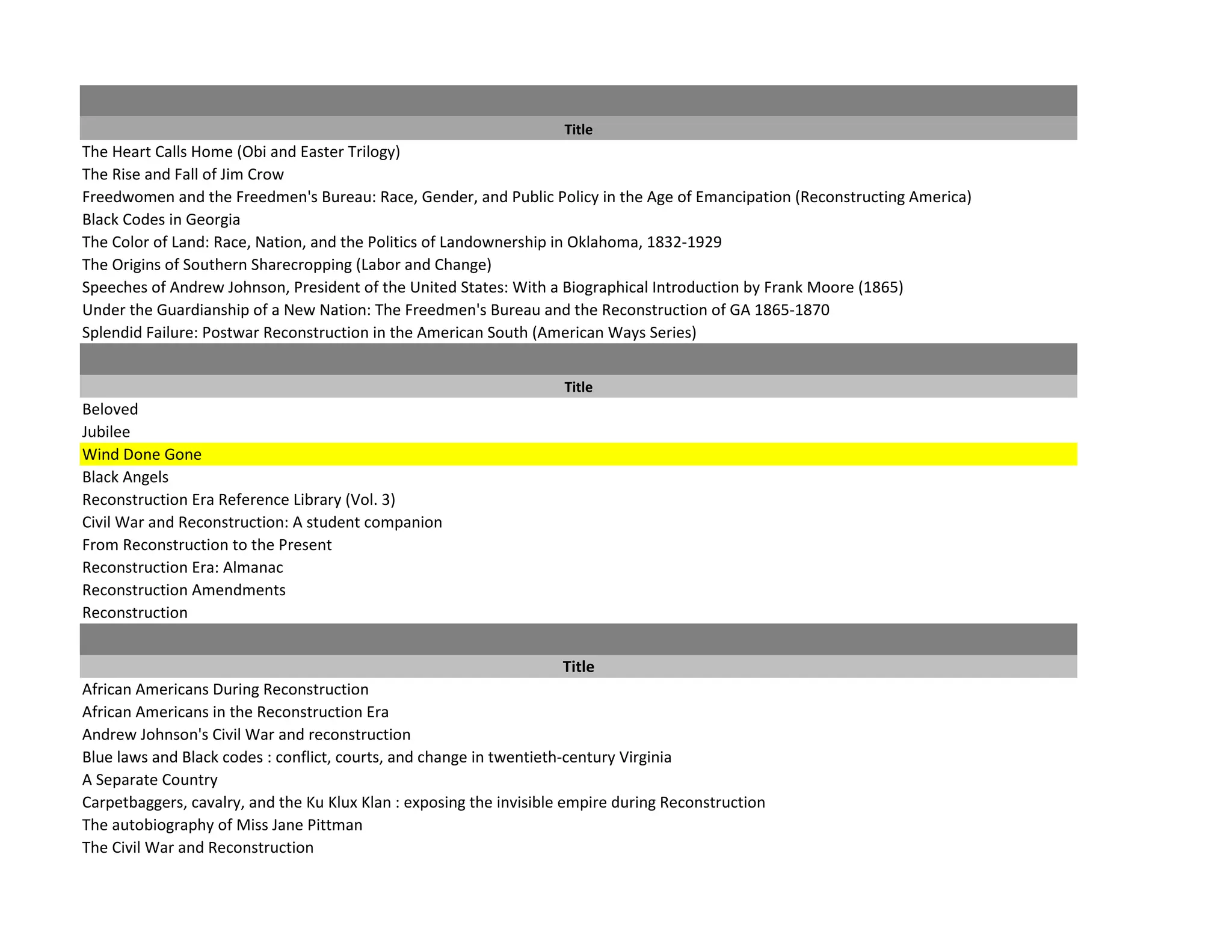 The document lists titles of various books, films, and other resources related to the Reconstruction Era in American history following the Civil War. The resources cover topics like the Freedmen's Bureau, Black Codes, sharecropping, speeches by President Andrew Johnson, and the Ku Klux Klan. The materials listed include young adult and adult books, reference books, documentaries, and primary sources published between 1971 and 2011 from a variety of academic and popular presses.
