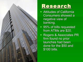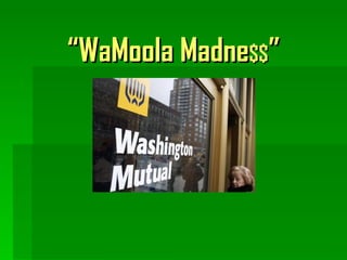 WaMoola Madne $$ was a PR stunt by WaMu bank where they put new $20 bills in a wind cube and let consumers grab as many bills as they could in 20 seconds to promote the new design. They matched the total amount grabbed in each of 7 cities and donated it to local housing non-profits. Media advisories and calls were made to promote the event which attracted large crowds and achieved greater reach and recognition than goals at a lower cost than the event.