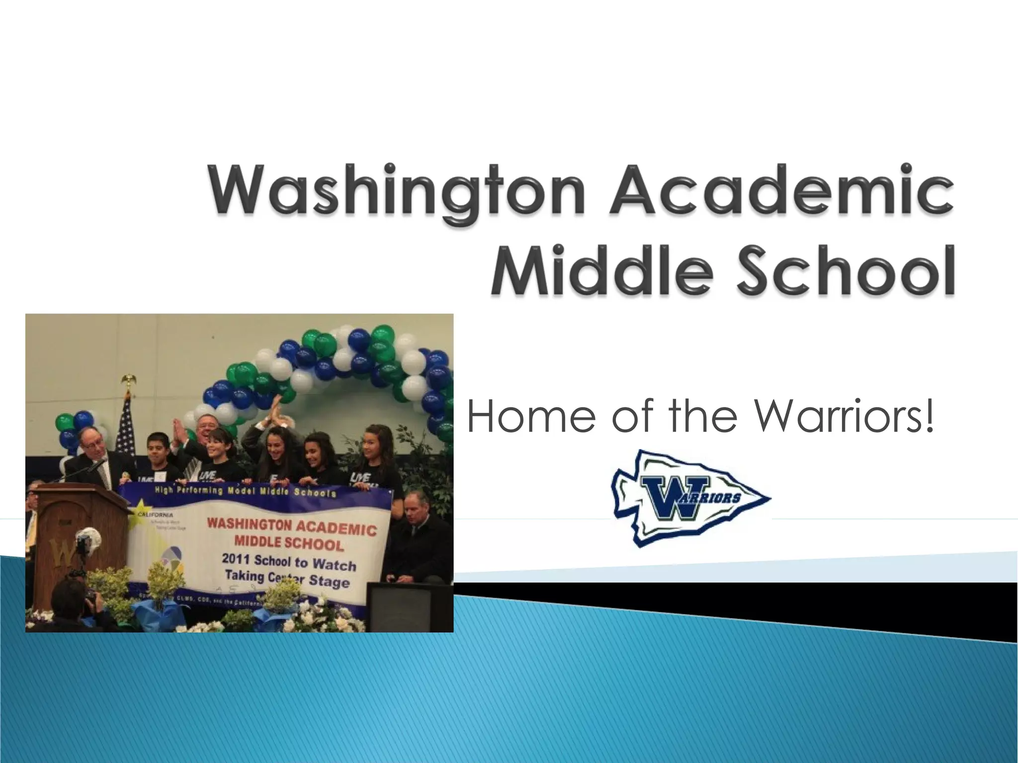 This document provides information about a middle school named as a "School to Watch" that has an administration team led by Principal Mrs. Nino. It discusses the school's understanding of parental fears about middle school and their willingness to help. It also provides details about the school's programs, courses, activities, and schedules to welcome new students and parents.