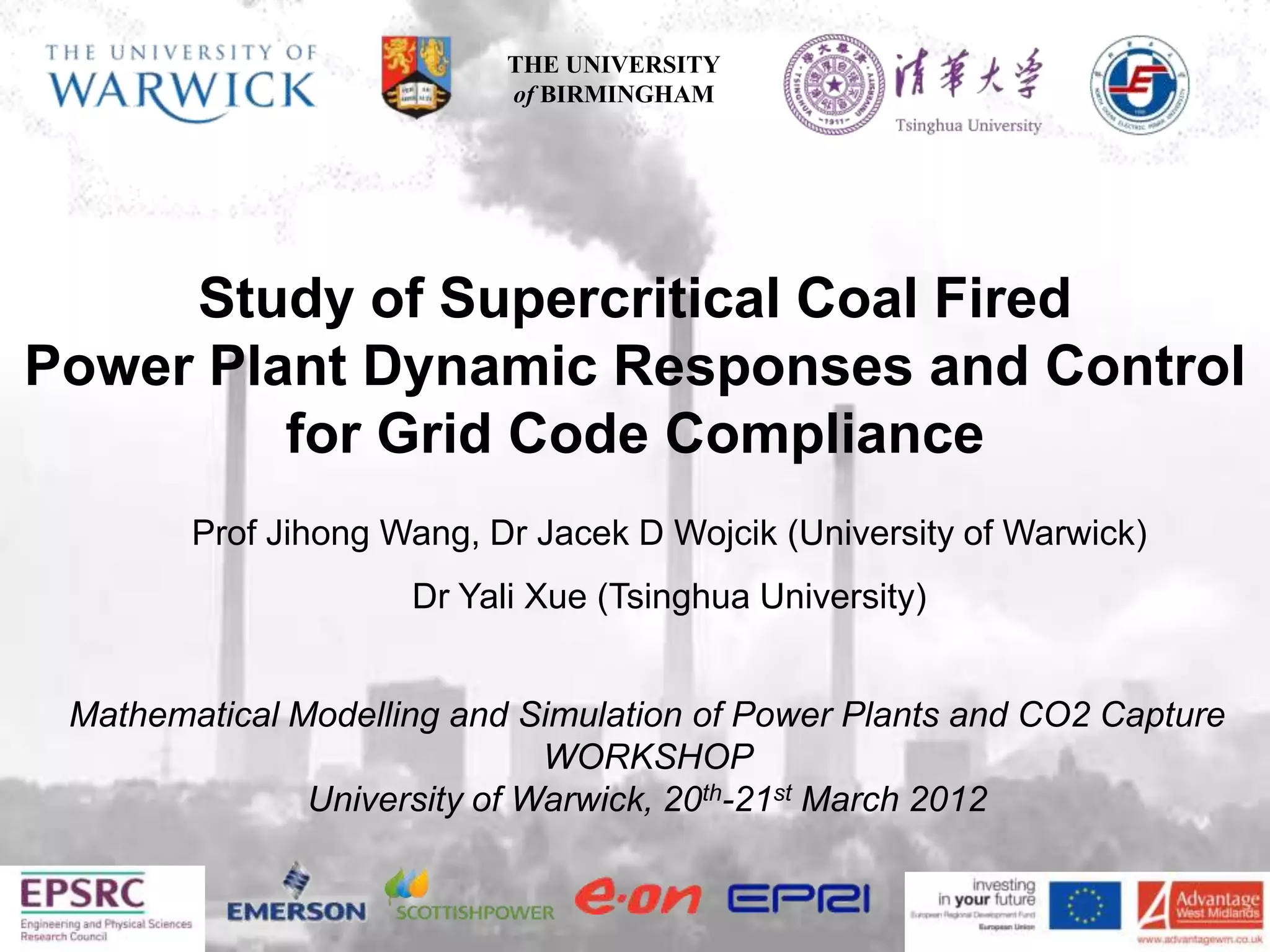 This document provides an overview of a workshop on mathematical modelling and simulation of power plants and CO2 capture. [1] It discusses modelling of supercritical coal-fired power plants, including models of the coal mill, supercritical boiler, steam turbine, and synchronous generator. [2] The models are implemented in MATLAB/Simulink and include differential equations representing the various components. [3] The workshop aims to understand the dynamic responses of supercritical power plants and investigate strategies to improve their ability to respond quickly to changes in electricity demand as required by grid codes.