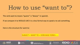 The document discusses the verb "want to" and how it is used to express desire or wanting to do something in a less formal way than "would like". It explains that "want to" follows the structure of subject + want to + verb base form. Examples are provided of the affirmative, negative, and interrogative forms using this structure, such as "I want to play soccer tomorrow" and "Does she want to dance salsa tonight?". The document was created by Sandrine Lafontant Diaz for distance education.