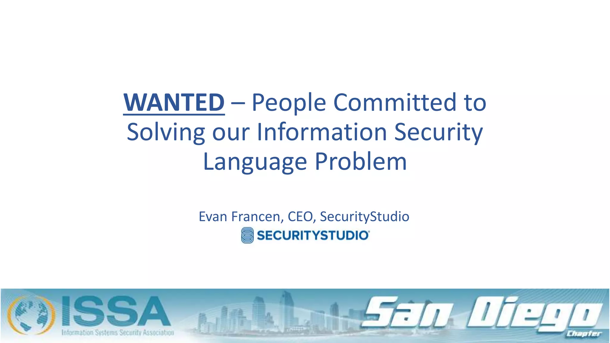 The document discusses solving the language problem in information security. It begins by explaining that information security is about managing risk by assessing threats and vulnerabilities, and using administrative, physical, and technical controls. It then introduces the S2Score as a simple scoring system to communicate security in a common language. The document advocates for making security assessments free and accessible to all, and developing translation tools to map different organizations' risk scoring systems to a common scale. The overall goal is to establish a shared security language to improve understanding and coordination across the industry.