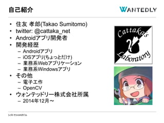 Sumitomo) • twitter: @cattaka_net • Androidアプリ開発者 • 開発経歴 – Androidアプリ – iOSアプリ(ちょっとだけ) – 業務系Webアプリケーション – 業務系Windowsアプリ • その他 – 電子工作 – OpenCV • ウォンテッドリー株式会社所属 – 2014年12月〜 自己紹介