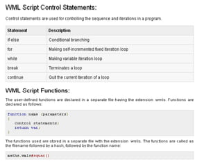 The document discusses the application layer of WAP including the WAP model, mobile location based services, WAP gateway, WAP protocols, WAP user agent profile, caching model, wireless bearers of WAP, WML, WML scripts, WTA, iMode, and SyncML. It provides definitions and details on the WAP architecture, protocols, and technologies to enable wireless internet access from mobile devices. The document also covers mobile location based services and applications, challenges, and examples of location based services that utilize a user's real-time geographical position.