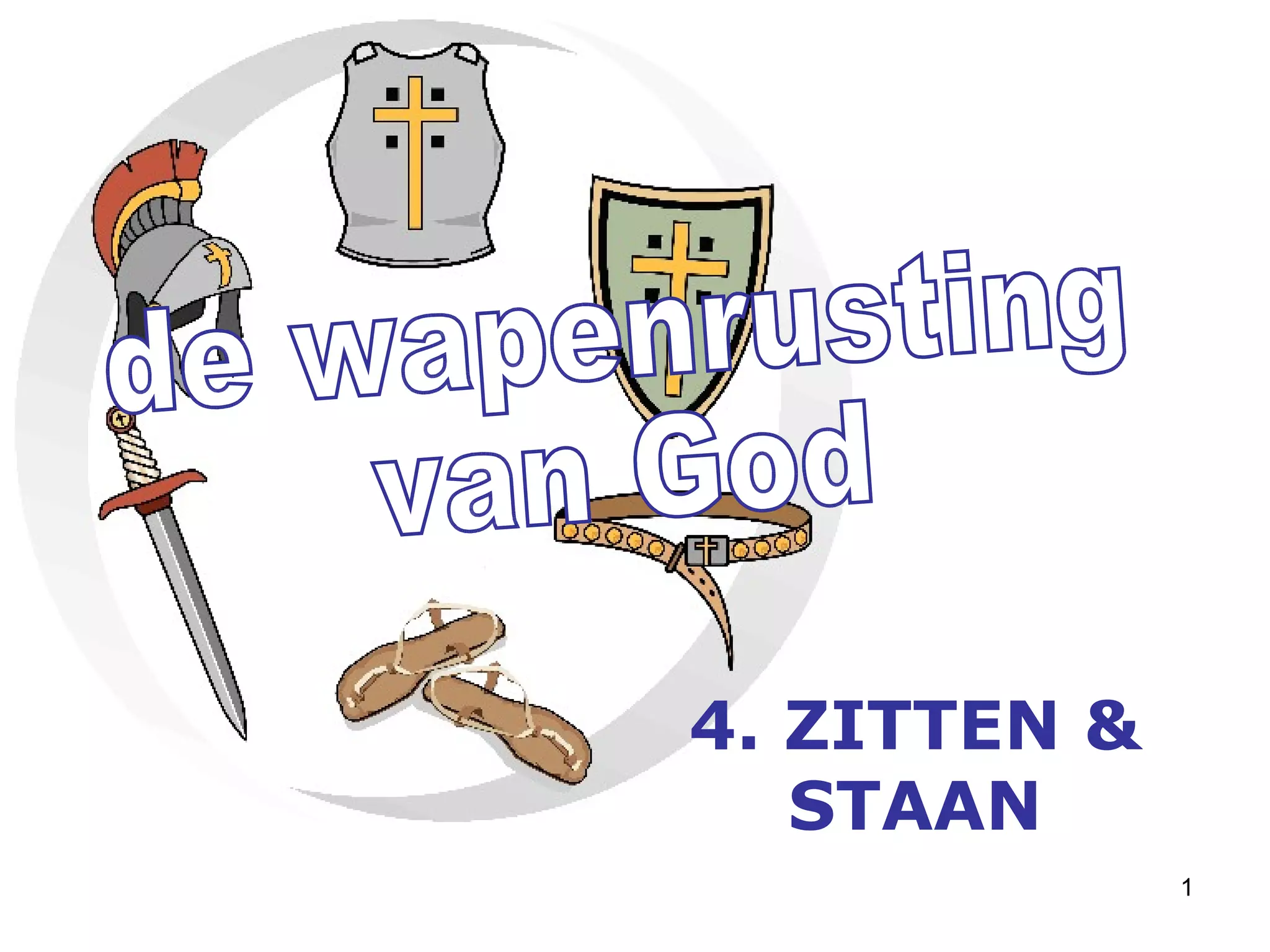 Efeze 6 - staan en standhouden ! "Doet de wapenrusting Gods aan, om te kunnen standhouden (lett. te staan )…" "Neemt daarom de wapenrusting Gods, om weerstand (lett. te weerstaan ) te kunnen bieden…" "uw taak geheel vervuld hebbende, stand te houden (lett. te staan )" "Stelt (lett. wees staande ) u dan op…"