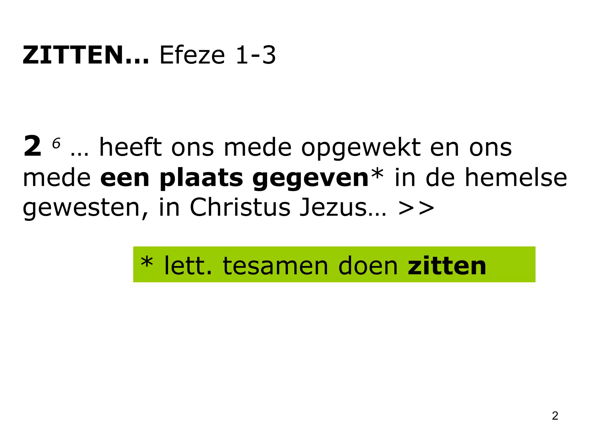 2 6 … heeft ons mede opgewekt en ons mede een plaats gegeven * in de hemelse gewesten, in Christus Jezus… >> ZITTEN… Efeze 1-3 * lett. tesamen doen zitten