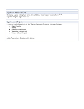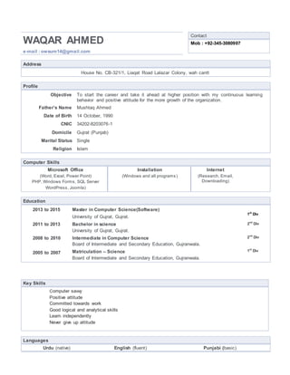 Waqar Ahmed is seeking a career opportunity where he can continuously learn and help the organization grow. He has a master's degree in computer science from the University of Gujrat. He has skills in Microsoft Office, PHP, SQL Server, WordPress, and Joomla. He has 6 months of experience working with SAP at Unilever Pakistan. He has also worked on software development projects in dot net, including developing logics, form validation, and designing logics. His areas of expertise include PHP and dot net.