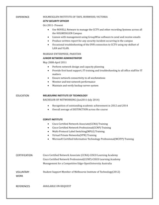This document contains a resume for Waqar Ul Hassan, who is seeking a role as a Network Engineer or Administrator. He has a Bachelor's degree in Networking from Melbourne Institute of Technology and almost 2 years of experience as a Junior Network Administrator and CCTV Security Officer. He has certifications including CCNA and CCNP and skills in networking, routing, switching, Windows, Linux and SQL.