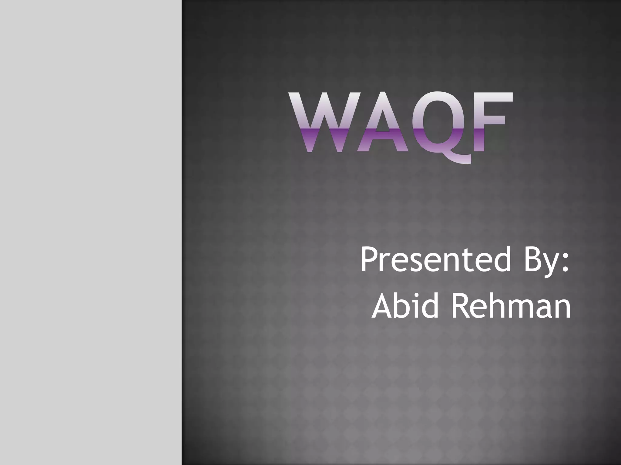 Waqf is an Islamic charitable endowment where a Muslim dedicates assets for religious or charitable purposes in perpetuity. A waqf is established through a legal contract where a waqif, or donor, transfers ownership of an asset to a mutawalli, or trustee, to administer it. The income generated is used for purposes outlined by the waqif, such as maintaining a mosque, supporting the poor, or funding an educational institution. The Mussalman Wakf Validating Act of 1913 defines waqf under Indian law and establishes rules regarding its creation, registration, and administration to benefit religious and charitable causes in accordance with Islamic principles.