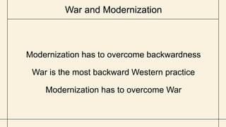 The document discusses the relationship between war, capitalism, and modernization, arguing that war serves as a means of economic competition and exploitation by capitalists. It outlines how imperialism and neocolonialism function to extract surplus value from foreign labor while raising questions about imperialism's evolution post-World War II. The author posits that the working class's resistance to war is crucial for achieving peace and facilitating modernization.