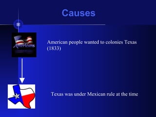 The document outlines the key events that led to the Texas War for Independence from Mexico between 1833 and 1836. It began as American settlers in Texas wanted more autonomy from Mexican rule. Mexico responded by banning further American immigration and slavery in Texas. Tensions rose and the first armed clashes occurred in 1835 at Gonzales and Conception. The Texans defeated the Mexican army at San Jacinto in 1836, securing Texas' independence, though it would not join the United States until 1845.