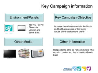 The campaign successfully increased Warburtons' brand awareness in the South of England. Rail advertising proved highly effective at boosting awareness of Warburtons' advertising. Posters further strengthened the brand's messaging around family values and encouraged positive word of mouth recommendations.