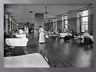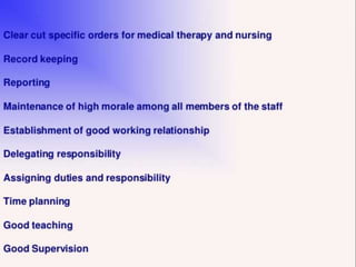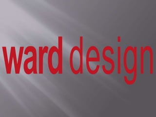 This document outlines several factors that affect ward management, including patient housing areas, sizes of rooms, locations of nursing stations, treatment rooms, clean and dirty utility rooms, dining areas, and bathrooms. It also describes different types of ward layouts such as open, Nightingale, Riggs, unilateral Riggs, and bilateral wards. Finally, it lists strategies for effective ward management like team spirit, positive reinforcement, economic working conditions, unity in following rules and regulations, orientation for new staff, ongoing education, guidance, and a trained administrator.