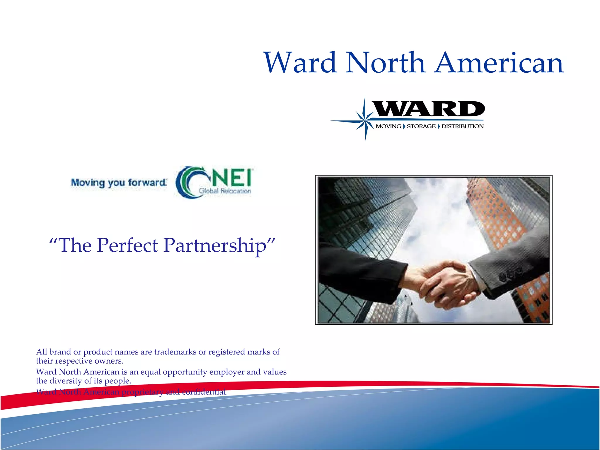 Ward North American is a global relocation solutions company that offers domestic and international relocation services, as well as office, industrial, warehouse and distribution services. They emphasize quality through their training programs, facilities, and customer service teams. Ward has received numerous awards and has been named Agent of the Year by North American Van Lines multiple times. Their vision is to be the most customer-focused provider of quality relocation services worldwide.