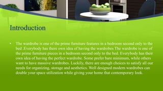 The document discusses different types of wardrobe designs including sliding door wardrobes, hinge door wardrobes, L-shaped wardrobes, walk-in wardrobes, and sloped wardrobes. Sliding door wardrobes save space compared to hinged doors and allow more free floor space. L-shaped wardrobes make efficient use of bedroom corners. Walk-in wardrobes provide maximum storage but require extra space. Sloped wardrobes are suitable for attic or under-stair areas. Custom wardrobes can be tailored to one's needs and space.