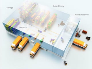 A warehouse management system (WMS) is an IT and management system that helps optimize warehouse operations from goods receipt to shipment. It provides real-time tracking of inventory and activities. A WMS manages tasks like receiving, storage, order preparation and dispatch. It uses hardware like handheld scanners and printers to guide workers through processes. Key features include automation, racking systems, transport systems and control software. Implementing a WMS can increase efficiency, control, visibility and productivity in warehouse operations.