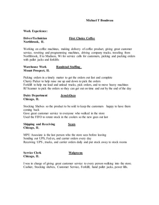 Michael T. Boudreau has extensive work experience in customer service and management across various roles, including technician, assembler, and manager in retail and food services. He has a strong background in training employees, ensuring customer satisfaction, and working efficiently with various tools and technologies. His experience spans over 20 years, highlighting his dedication to both teamwork and effective problem-solving.