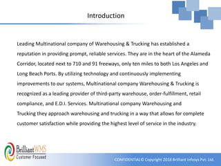 The document outlines a case study for a warehouse delivery management system by a leading multinational warehousing and trucking company. It identifies key problem areas such as space management, communication, and inventory accuracy, and proposes solutions including a warehouse management system with features like order distribution and quality control. The company is focused on improving customer satisfaction and operational efficiency through continuous technological advancements.