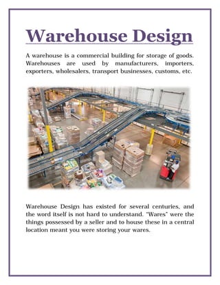 Warehouse design has existed for centuries to store goods centrally. A warehouse is a commercial building used by manufacturers, importers, exporters and others to store wares. There are different types of warehouses including private, public, contract, government and bonded warehouses. Warehouse design considers efficient loading and unloading of goods from transportation modes and consolidation of items.