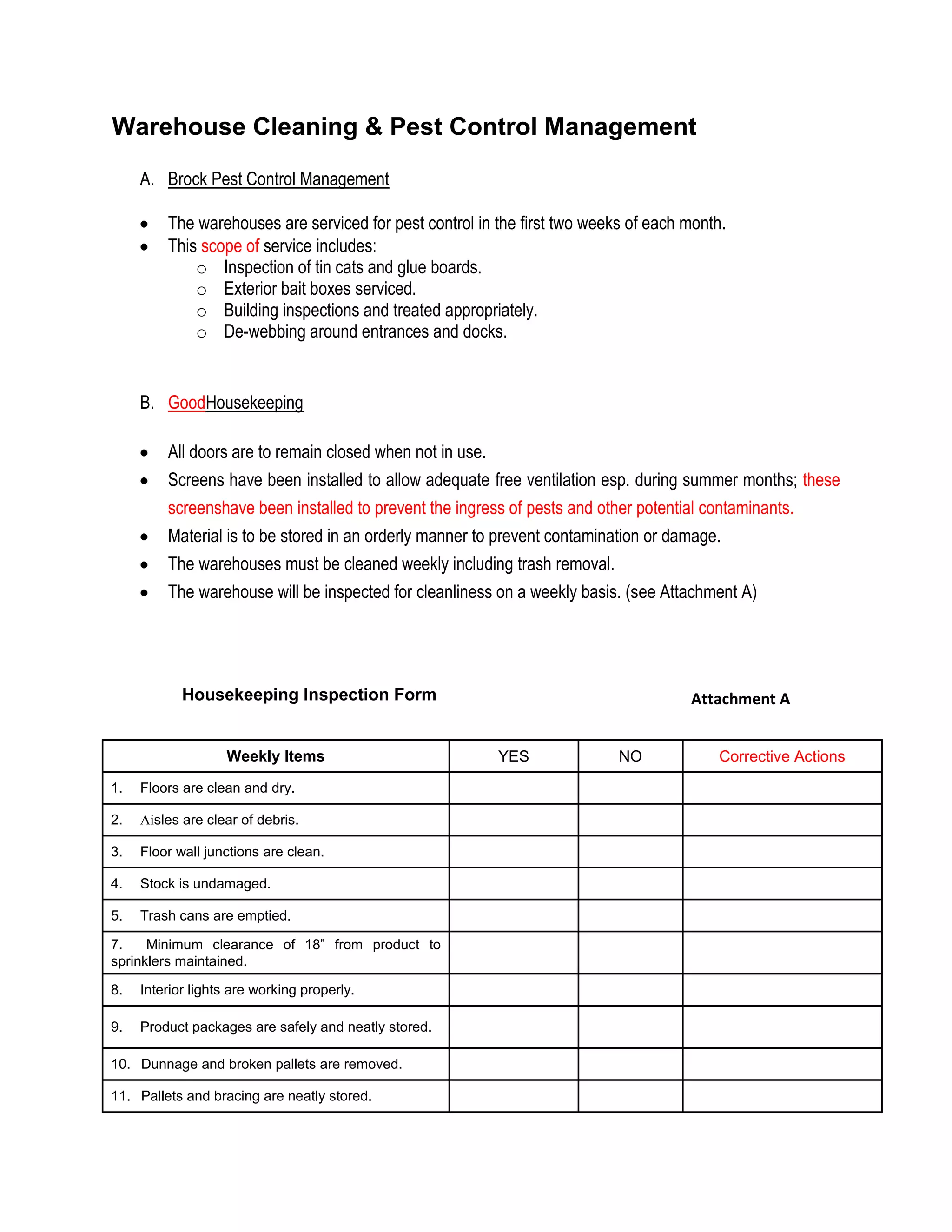 The warehouses are serviced for pest control in the first two weeks of each month, including inspection of traps, servicing of exterior bait boxes, building inspections and treatments. All doors are to remain closed when not in use and screens have been installed to allow ventilation while preventing pest ingress. The warehouses must be cleaned weekly including trash removal and will be inspected weekly using an inspection form to check cleanliness standards are met such as clear aisles, clean floors and walls, and no signs of pests or leaks.