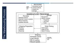 Warehouse management involves several key processes including receiving, put-away, storage, order picking, packing and shipping. The document discusses various warehouse functions like inventory management, space utilization, picking optimization and product diversification. It also covers different types of warehouses based on purpose and products handled. Technology interventions like RFID, WMS, ERP and smart warehouse concepts are changing the way warehouses operate by improving efficiency. The case study highlights how Future Supply Chain transformed its operations by establishing a central mother DC in Nagpur, India which utilizes various technologies and follows a hub and spoke model to efficiently distribute goods.