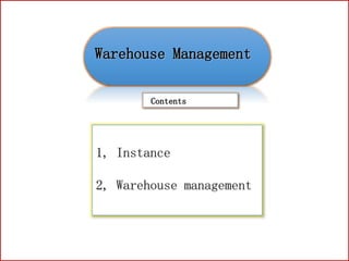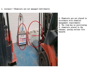1. The document discusses warehouse management and highlights issues with improper chemical storage posing fire hazards, lack of positioning of items, and materials not being stored according to requirements.